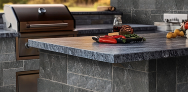All natural granite stone legs and top pair beautifully with the cast iron insert. Each of the three granite legs feature a hand carved flame embellishment. More: www.StoneAgeCreations.com