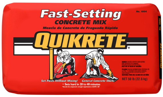 QUIKRETE® Fast-Setting Concrete Mix is a special blend of fast-setting cements, sand and gravel designed to set hard in approx. 20 to 40 minutes. Sets posts without mixing. Pour dry mix into hole and soak with water.